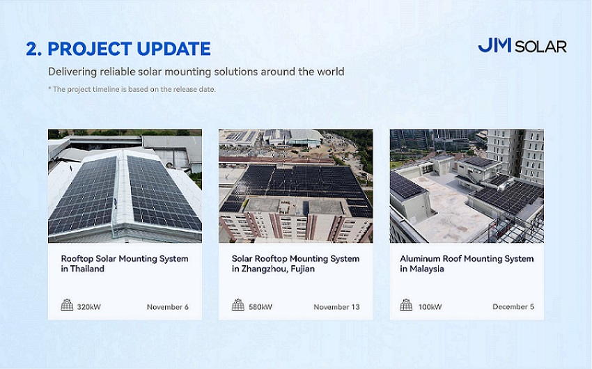 11月6日、 タイの320kW屋上プロジェクトジンメガの屋上設置システムを使用して完了し、迅速な設置と地域の気候条件における信頼性の高い荷重性能のバランスを実現しました。11月13日には、 福建省漳州市の580kW屋上プロジェクト大規模な商業施設の屋上への当社のシステムの適合性を紹介し、効率的な施工と長期的な安定性を実現しました。12月5日には、 マレーシアにおける100kWアルミ屋根架台プロジェクト耐腐食性と軽量素材を組み合わせた、熱帯環境に最適な利点を強調しました。