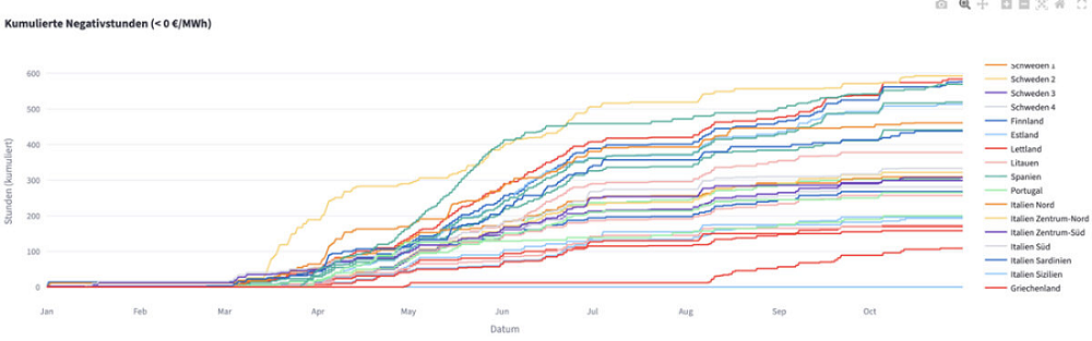 Strommarkt-Appツールの分析によると、再生可能エネルギー発電量の急増と気象変動がヨーロッパの電力システムに負担をかけているため、ヨーロッパ大陸全体でマイナス価格期間の継続時間が急増しています。10月末時点で、マイナス価格期間の数はスウェーデンの第2価格帯で593時間と最も多く、次いでオランダ(584時間)、ドイツ(576時間)、スペイン(569時間)、ベルギー(519時間)、フランス(513時間)となっています。