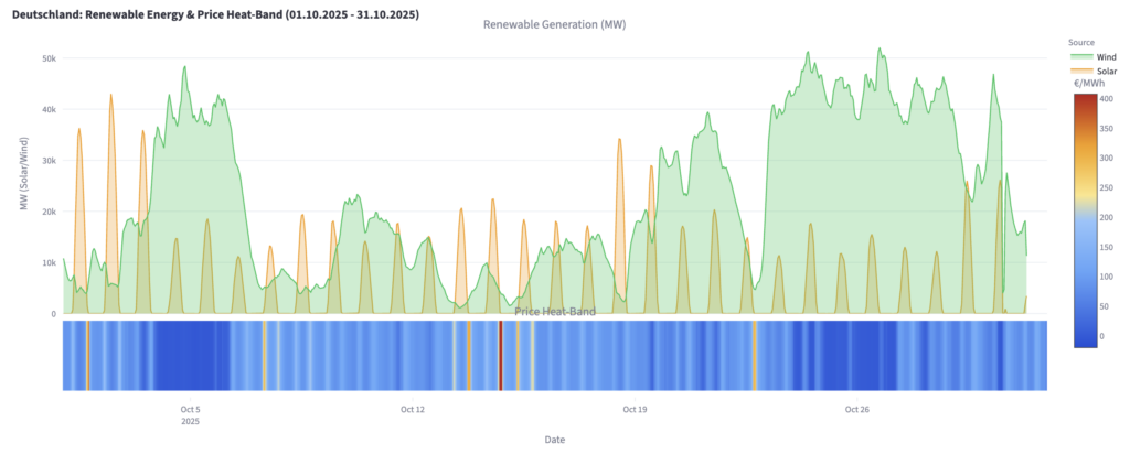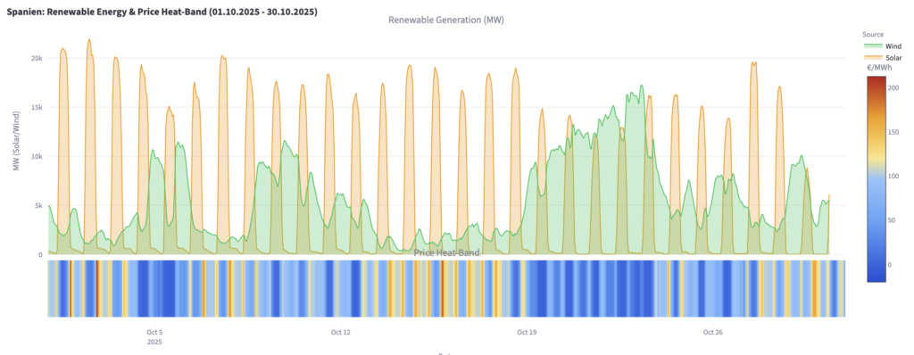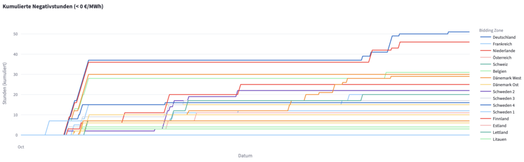 10月単月では、ドイツが欧州エネルギー取引所(EEU)におけるマイナス価格時間の最多記録(51時間)を記録し、次いでオランダ(46時間)、ベルギー(31時間)、デンマーク西部(30時間)となりました。スペインとフィンランドも、それぞれ29時間と25時間を記録し、欧州の月間平均である約19時間を上回りました。